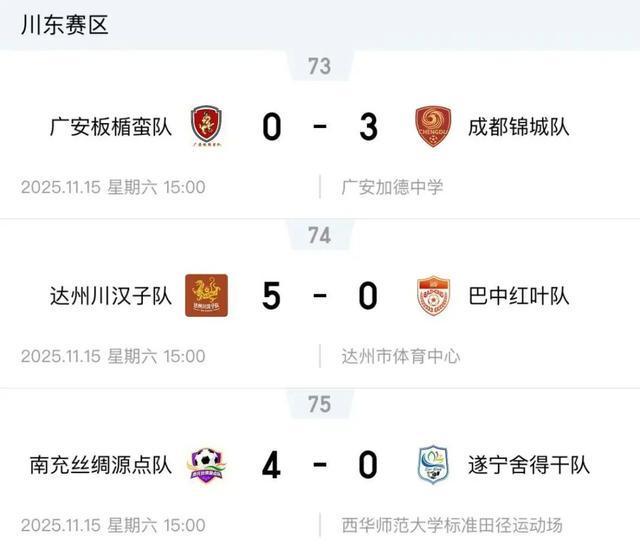 我们将为您提供川超联赛最新比赛信息!第九轮,第一名的争夺仍在继续,一场致命的比赛从罚球和帽子戏法开始。最新战况一目了然! *截至11月16日,川东赛区按赛区组织。图片来源:足球中国APP 广安半真曼队 成都金城队 11月15日,2025/2026四川银行四川省城市足球联赛第九轮比赛,广安半真曼队在当地广安市翡翠中学对阵成都金城队。最终,成都金城客场3-0获胜。本场比赛结束后,决定川东赛区第四名的广安队被淘汰出预赛。达州四川汉子队、巴中红叶队将于2025/2026赛季川行四川省城市足球联赛第九回合开赛。11月15日!达州四川汉子队将在主场迎战巴中红叶队。这场对决直接关系到达尔州队能否提前出线。中场休息后,两队都调整了阵容。经过对决,最终比分是5:0。凭借主场大胜,达州队提前晋级川超第二阶段。南充丝源队遂宁舍德队11月15日,2025/2026四川银行四川省城市足球联赛第九轮比赛中,南充丝源队主场迎战遂宁舍德队。南充队凭借最初的弹幕、快速反击、点球和任意球的出色表现,以4-0击败遂宁队。川东赛区排名来源:四川观察(以下同)川西赛区眉山天朗雅安千骑队2025/2026四川银行四川省第九轮l 城市足球联赛川西赛区于11月15日开赛,眉山天柔主场迎战雅安千骑队。经过90分钟的鏖战,排名第三的梅山沙天柔队主场2-0击败雅安天螺队。梁山好医生队与乐山威威超级队11月15日,2025/2026四川银行省城市足球联赛川西赛区第九轮比赛中,梁山好医生队主场迎战乐山威威超级队。本场比赛开始前,两队均判定出线。梁山队积16分排名第一,乐山队积14分排名第二。可以说,这是一场争夺首发位置的战斗。最终,凉山队与乐山队3-3战平。全场比赛结束,凉山队积17分锁定川西赛区第一名,乐山队锁定川西赛区第二名。川西赛区预选赛川北赛区阿巴雪山鹰对阵德阳重机 11月16日,四川银行四川省城市足球联赛2025/2026川北赛区第9轮比赛中,阿巴雪山鹰主场迎战德阳重机。最终,德阳队5-0战胜阿坝队。最后一轮,德阳队将坐镇主场迎战资格赛对手广元队。此战,德阳队必须获胜才能获得川北赛区最后一个名额。广元剑门雄关队对阵甘孜县有机牦牛队 11月16日,四川银行四川城市足球联赛2025/2026赛季川北赛区第九轮比赛中,广元剑门雄关队主场迎战甘孜县有机牦牛队。本场比赛双方实力悬殊,实力悬殊。广元队志在争夺一个名额,但甘孜队在川北地区以一分垫底国际。全场比赛结束,光原队主场2-0战胜甘子队。最后一场比赛他们客场对阵东洋队。如果出现平局,则保证参赛资格。川北赛区预选赛、川南赛区泸州椒乡队对阵宜宾长江资本队11月16日下午,四川银行四川省城市足球联赛2025/2026四川南赛区联赛第九轮比赛中,泸州椒乡队主场对阵宜宾长江创业队。泸州队依靠边球战术,在下半场第61分钟破门,1-0击败宜宾队,成功拿下这场强强对话。资阳中药队 自贡登城神龙队 11月16日,2025/2026四川银行四川省城市足球联赛川南赛区第九轮比赛中,资阳中药队主场迎战自贡登城神龙队。在最终,全场比赛结束,自贡队以4:3的比分险胜资阳队。川南赛区射手排名赛最后一轮就在本周末!我们来看看吧! Part.01 四川东部赛区 图片来源:四川体验(以下简称同) 01 成都 VS 南充 ✅比赛时间:2025年11月22日 15:00(热身赛14:30开始) ✅比赛地点:双流体育中心 ✅比赛球队:成都金城队 VS 南充丝源队 ✅门票价格:8元/18元/28元✅ 门票开始时间:11月17日下午2:00 ✅ 购票门票:进入四川看、大麦APP或成都地保公众号,在对话框中回复【成都川超联赛】即可获取购票入口、赛程、观赛指南、参赛阵容及直播入口(持续更新)。 02、接着宁VS达州 ✅比赛时间:2025年11月22日15:00 ✅比赛地点:遂宁市体育中心✅比赛球队:遂宁舍德县队 VS 达州四川汉子队 ✅门票价格:6.6元、9.9元 ✅门票开放时间:11月17日起 16:00 ✅购票券:四川天文台、大麦APP03雅楚VS广安 ✅比赛时间:2025年11月22日15:00 ✅比赛地点:雅楚体育中心 ✅比赛球队:雅楚广代队 VS 广安邦城男子队 ✅ 门票价格:9.9元 ✅ 开始售票时间:11月18日19:00 ✅ 购票券:四川天文台、大麦APP Part.02川西赛区01 雅安VS凉山 ✅ 比赛时间:2025年11月22日15:00 ✅ 比赛地点:雅安市体育中心 ✅ 比赛球队:雅安迁西队VS凉山良医队✅门票价格:0元。 ✅ 开放售票时间:11月17日12:00 ✅ 购票入口:四川天文台、戴米APP Part.03川南赛区01 内江VS泸州 ✅ 比赛时间:2025年11月23日15:00(热身赛14:30开始) ✅ 比赛地点:内江高级技工学校 ✅ 比赛地点上午:内江崇龙酒队VS泸州椒香队 ✅门票价格:9.9元 ✅门票开始时间:11月17日16:00 ✅购票票:四川观象台、大麦APPPart.04川北赛区01、德阳VS广元 ✅比赛时间:2025年11月23日15:00(热身表演14:30开始) ✅比赛比赛地点:德阳体育公园体育场 ✅比赛球队:德阳重装队 VS 广原剑门汤关队 ✅门票价格:9.90元 ✅开票时间:第二轮 开票时间:11月18日10:00 ✅购票门票:四川观景等更多大麦app动态持续更新(成都土宝)