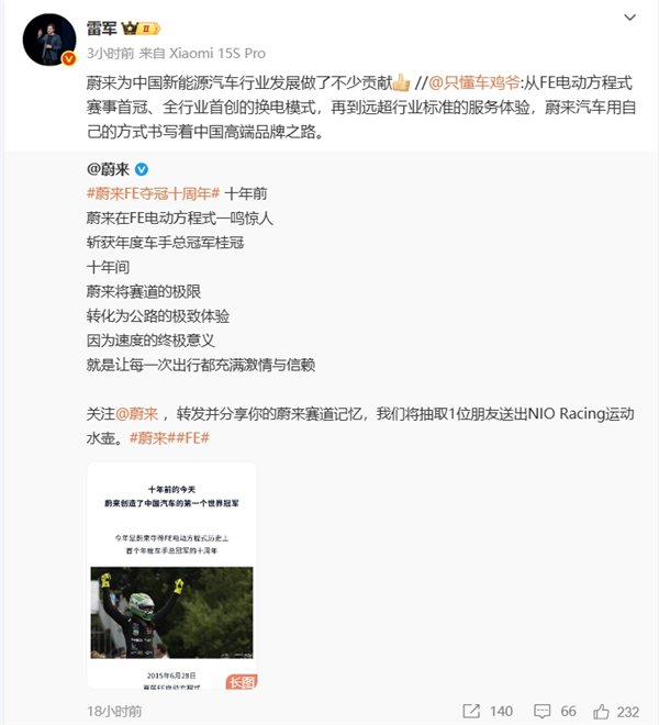 雷·朱约(Lei Jun)赞扬尼奥(Nio)对汽车行业的